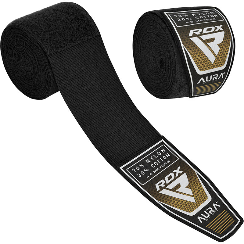Switch to RDX Aura Plus T-17 Hand Wraps and stay away from micro fractures - wrist injuries - and broken bones! Designed for durability - functionality - and breathability. These wraps are crafted with a blend of nylon and cotton - providing unmatched wrist support with a generous length of 4.5 metres. The elasticated design ensures a customised fit - while the thumb loop enhances security and accurate positioning. The Quick-EZâ„¢ hook and loop closure makes for easy fitting. Available in multiple colour options.